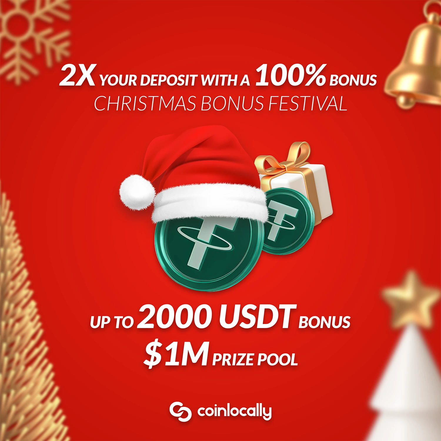 Christmas is here, and Coinlocally is celebrating it with a bonus that actually adds value to your trading. From December 17 to December 22, all Coinlocally users can activate a 100% deposit bonus and double the amount they deposit, up to 2,000 USDT.
